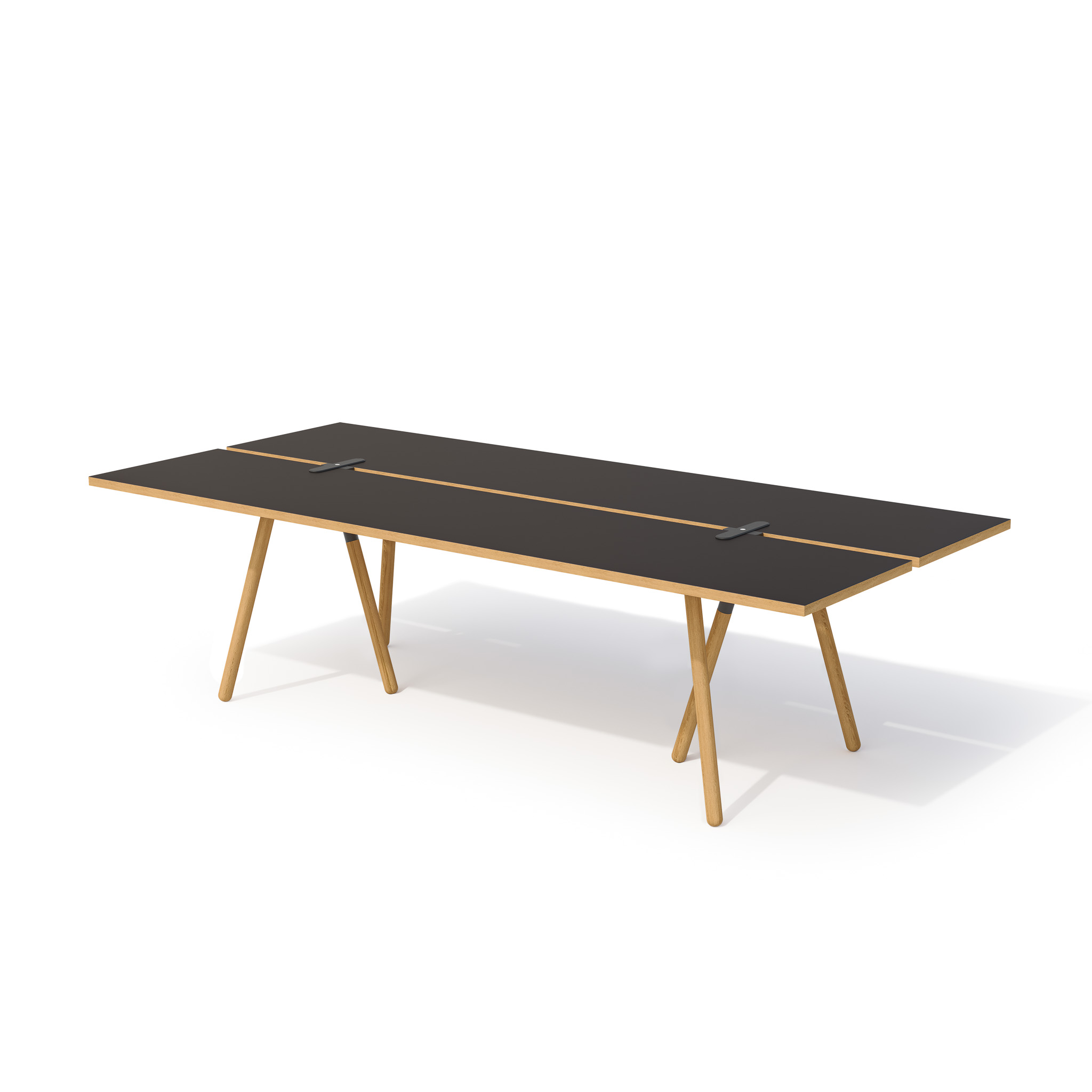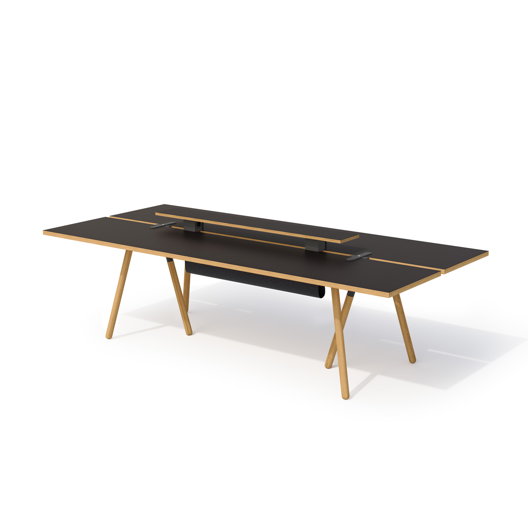 Flow features a reversible two-tone melamine tabletop for quick aesthetic changes. When ordered with an additional shelf, it includes two built-in power sockets and a felt under-table screen to neatly manage cords.